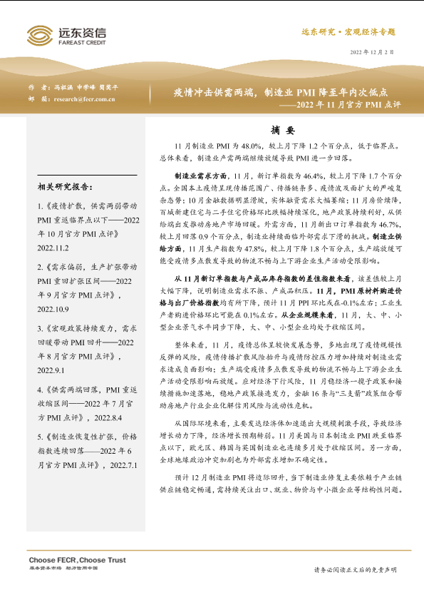 【远东资信】【20221202】远东资信-2022年11月官方PMI点评:疫情冲击供需两端,制造业PMI降至年内次低点-14页