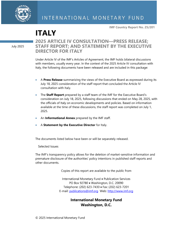 【国际货币基金组织】【202507】Italy - 2025 Article IV Consultation—Press Release; Staff Report; and Statement by the Executive Director for Italy-87页