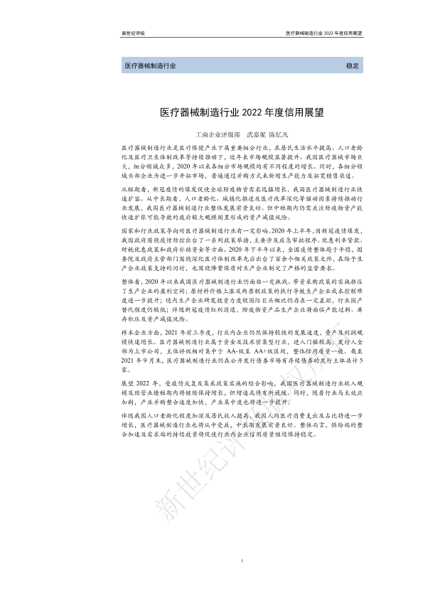 【新世纪评级】【20220101】医疗器械制造行业2022年度信用展望-21页