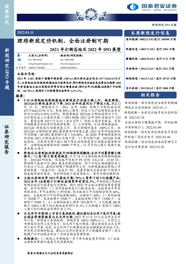 【国泰君安证券】【20220111】2021年打新总结及2022年IPO展望:理顺新股定价机制,全面注册制可期-25页