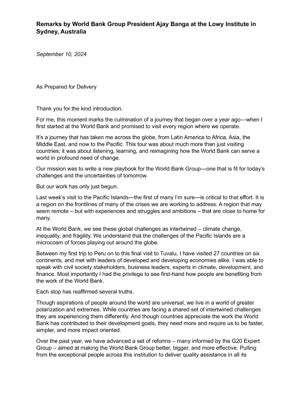 【World Bank Group】【20240910】Remarks by World Bank Group President Ajay Banga at the Lowy Institute in Sydney, Australia-3页
