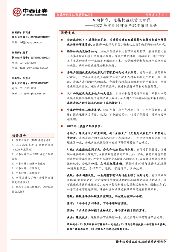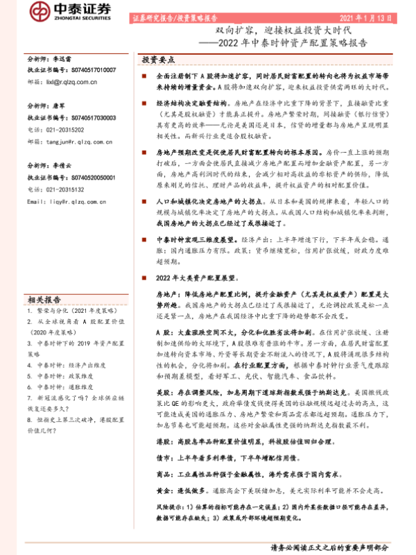 【中泰证券】【20220113】2022年中泰时钟资产配置策略报告:双向扩容,迎接权益投资大时代-23页
