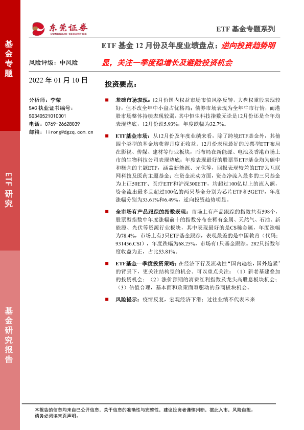 【东莞证券】【20220110】ETF基金12月份及年度业绩盘点:逆向投资趋势明显,关注一季度稳增长及避险投资机会-16页