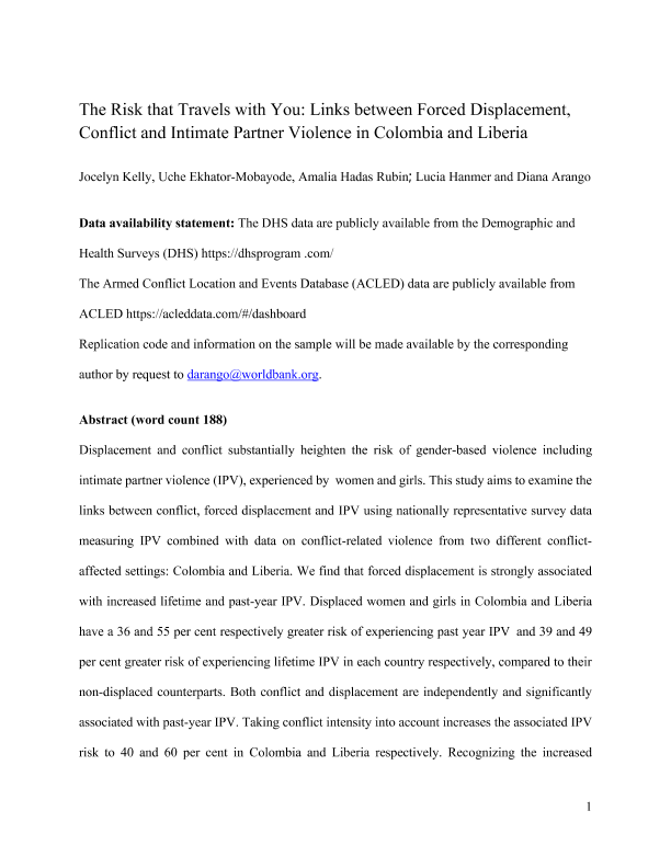 【Jocelyn Kelly&Uche Ekhator-Mobayode&Amalia Hadas Rubin&Lucia Hanmer and Diana Arango】【2022】The Risk that Travels with You Links between Forced Displacement, Conflict and Intimate Partner Violence in Colombia and Liberia-45页