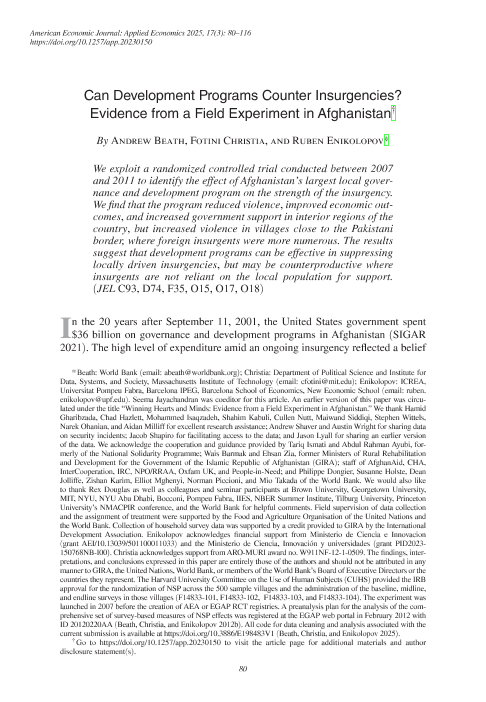 【Andrew Beath&Fotini Christia&Ruben Enikolopov】【2025】Can Development Programs Counter Insurgencies? Evidence from a Field Experiment in Afghanistan-37页