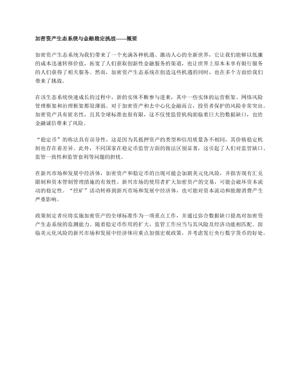 加密资产 央行数字货币 金融稳定 去中心化金融 稳定币
