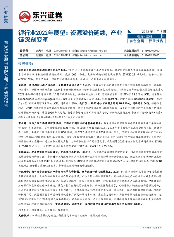 【东兴证券】【20220107】锂行业2022年展望:资源溢价延续,产业链深刻变革-19页