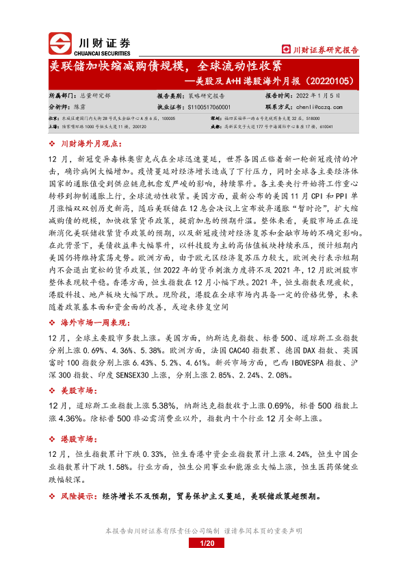 【川财证券】【20220105】美股及A+H港股海外月报:美联储加快缩减购债规模,全球流动性收紧-20页