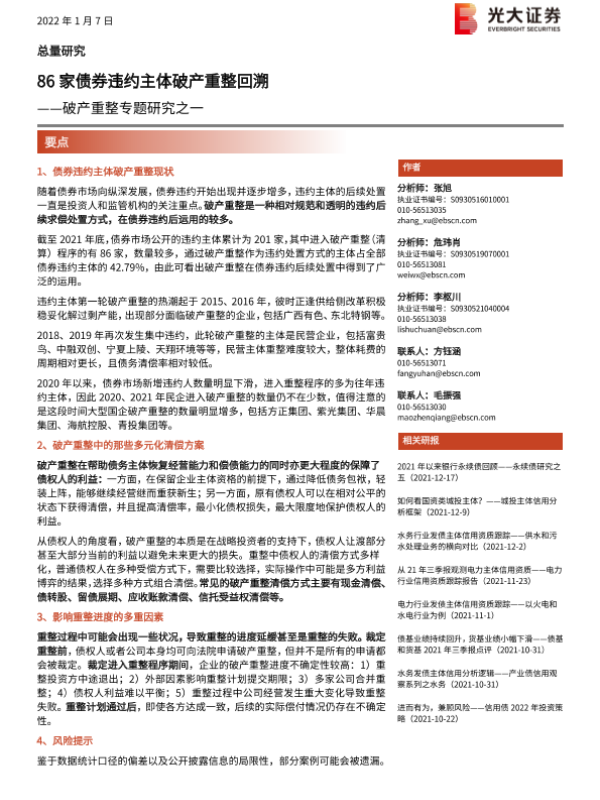 【光大证券】【20220107】破产重整专题研究之一:86家债券违约主体破产重整回溯-18页