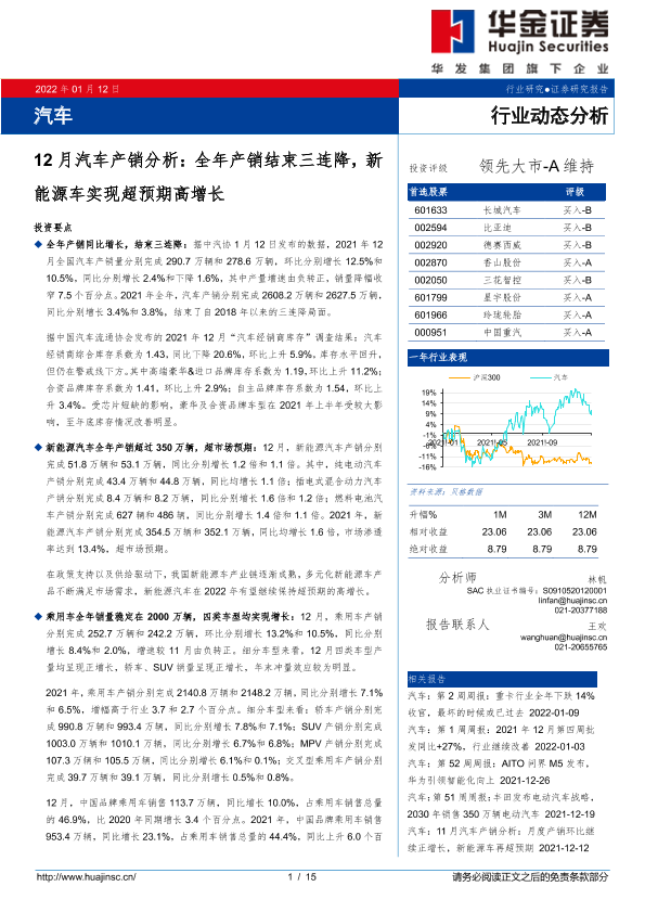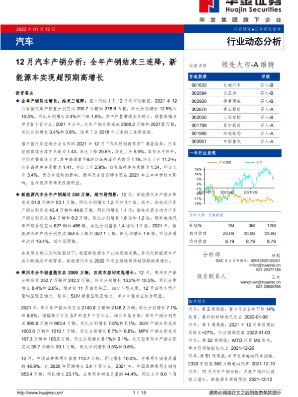 【华金证券】【20220112】汽车行业12月汽车产销分析:全年产销结束三连降,新能源车实现超预期高增长-15页