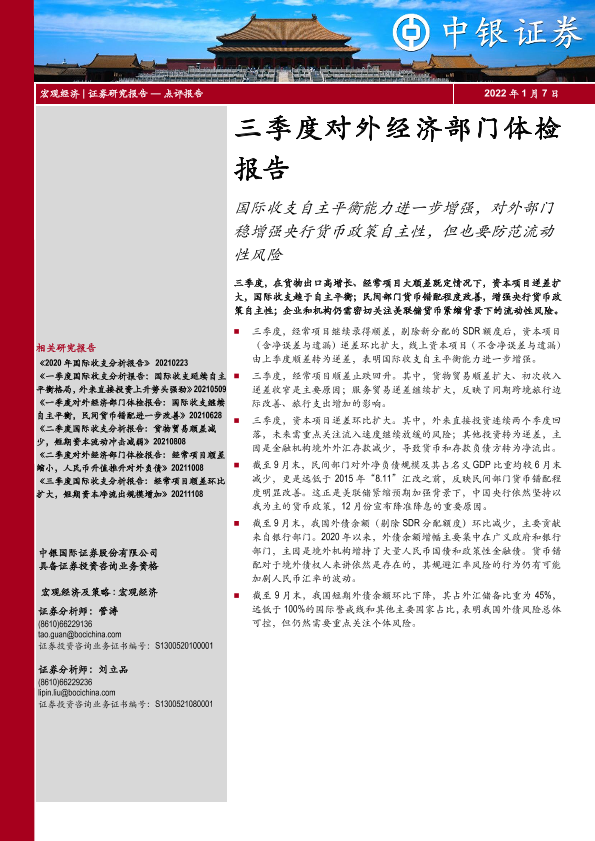 【中银证券】【20220107】三季度对外经济部门体检报告:国际收支自主平衡能力进一步增强,对外部门稳增强央行货币政策自主性,但也要防范流动性风险-15页