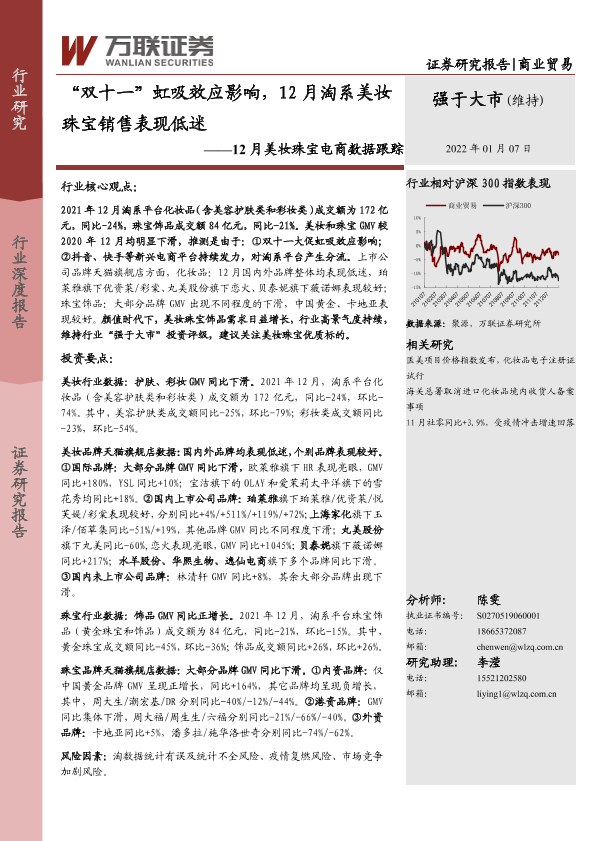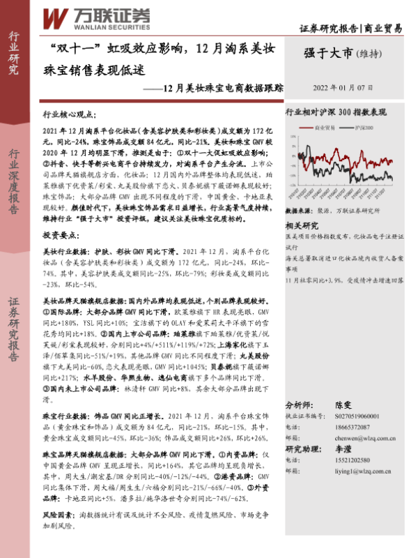 【万联证券】【20220107】商业贸易行业12月美妆珠宝电商数据跟踪:“双十一”虹吸效应影响,12月淘系美妆珠宝销售表现低迷-16页