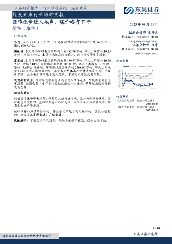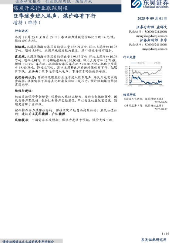 【东吴证券】【20250901】煤炭开采行业跟踪周报-旺季逐步进入尾声,煤价略有下行-10页
