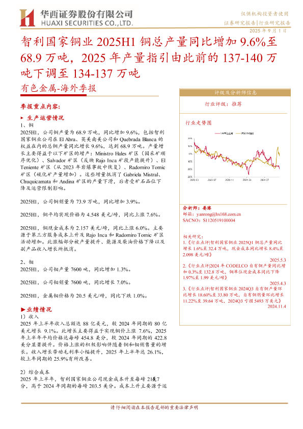 【智利国家铜业公司】【20250901】智利国家铜业-2025H1铜总产量同比增加9.6%至68.9万吨,2025年产量指引由此前的137-140万吨下调至134-137万吨-8页