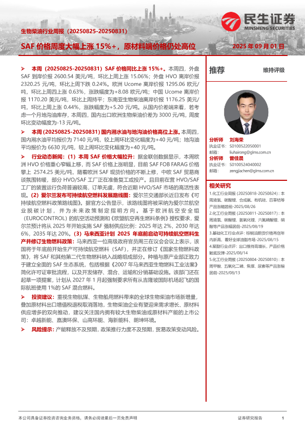 【民生证券】【20250901】SAF价格周度大幅上涨15%+,原材料端价格仍处高位-7页