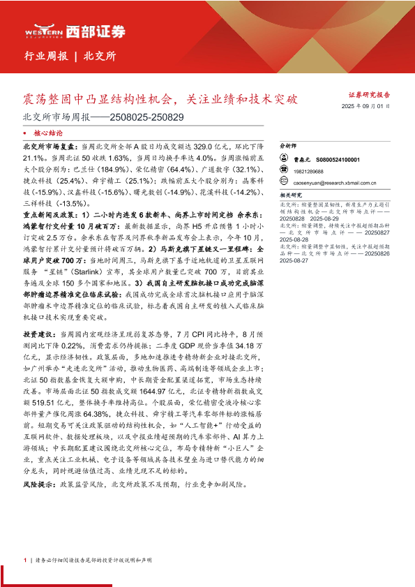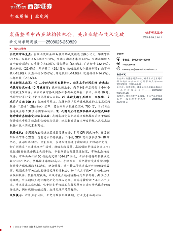 【西部证券】【20250901】北交所市场周报:震荡整固中凸显结构性机会,关注业绩和技术突破-8页