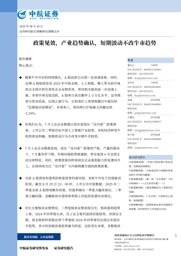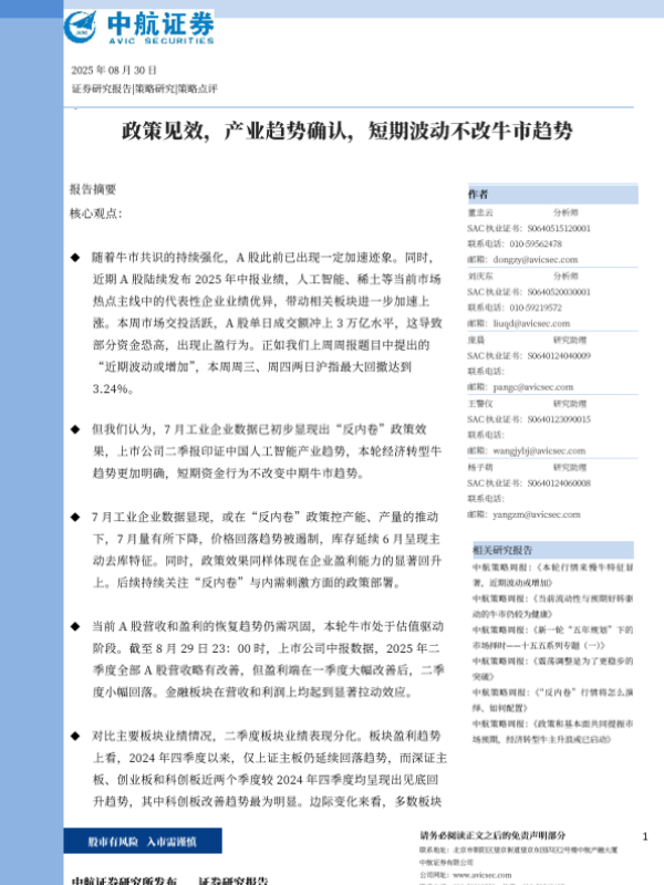 【中航证券】【20250830】政策见效,产业趋势确认,短期波动不改牛市趋势-8页