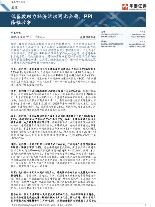 【华睿研究】【20250902】低基数助力经济活动同比企稳,PPI降幅收窄-6页