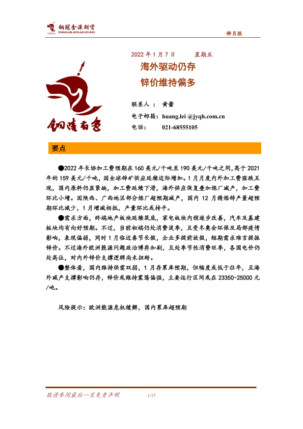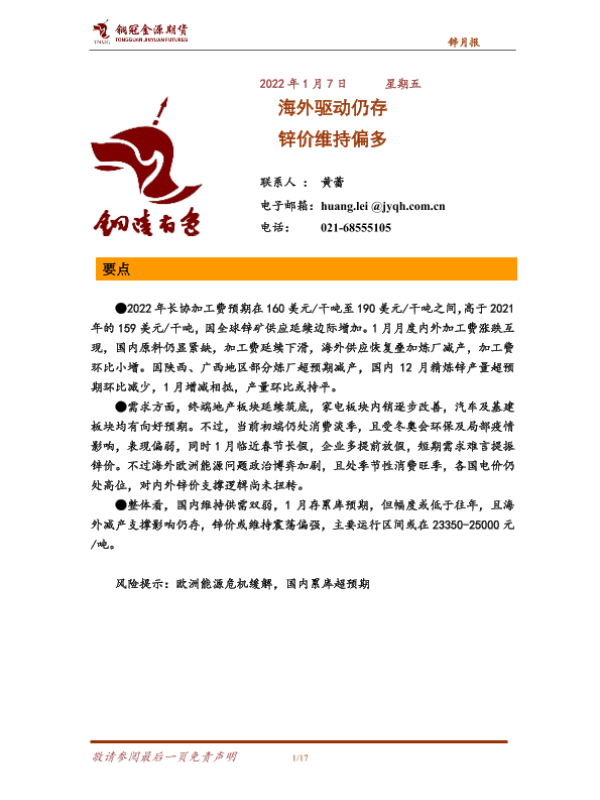 【铜冠金源期货】【20220107】锌月报:海外驱动仍存,锌价维持偏多-17页