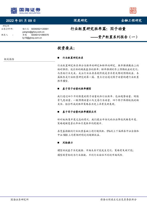 因子动量 胜率模型 行业配置 资产配置 金融工程