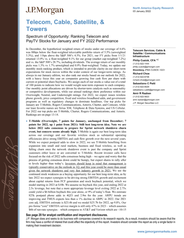【J.P. Morgan】【20220103】机会范围:1月和2022财年电信和付费电视股票业绩-23页