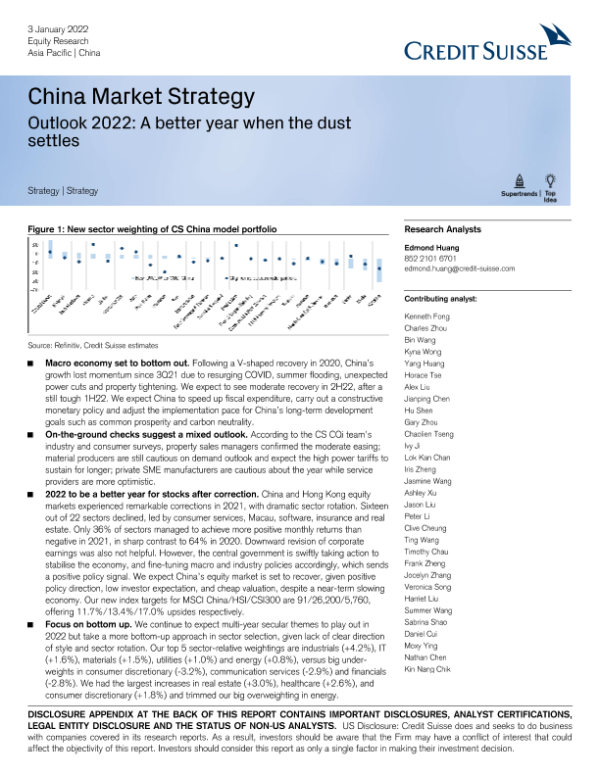 【Credit Suisse】【20220103】瑞信-中国投资策略-展望2022年:尘埃落定后会是更好的一年-79页