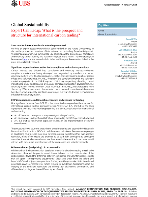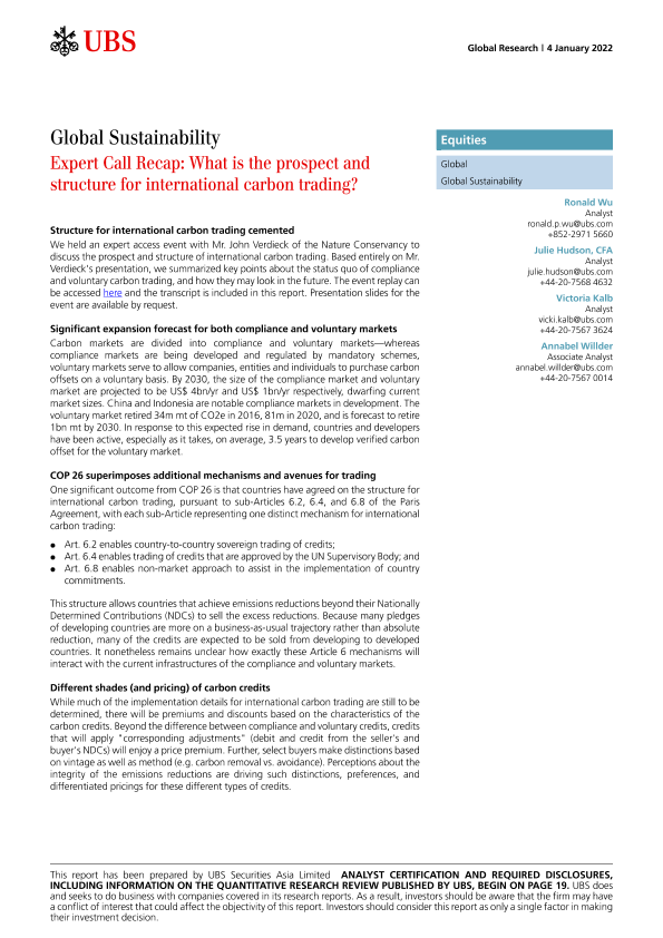 【瑞银】【20220104】瑞银-全球投资策略-专家电话综述:国际碳交易的前景和结构如何-23页