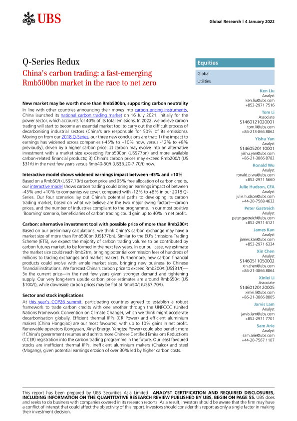 【瑞银】【20220104】瑞银-全球公用事业行业-中国的碳交易市场:一个规模达5000亿元的快速崛起的市场,正在努力实现碳零排放-63页