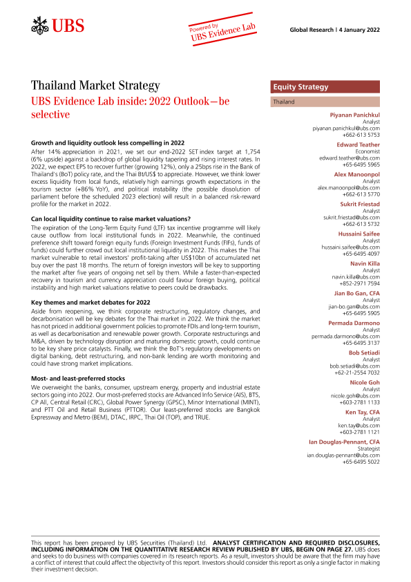 【瑞银】【20220104】瑞银-亚太地区投资策略-泰国:2022年展望将是选择性的-31页