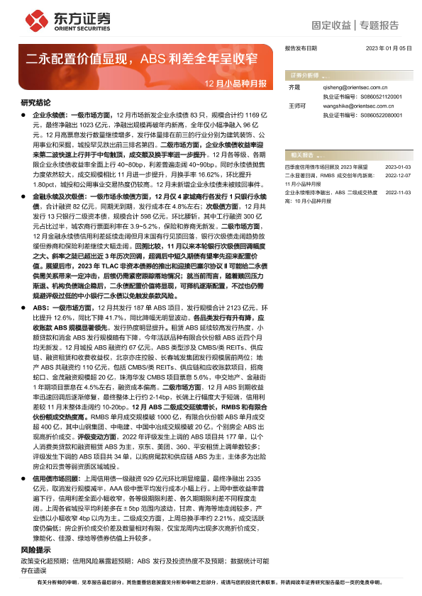 【东方证券】【20230105】12月小品种月报:二永配置价值显现,ABS利差全年呈收窄-25页