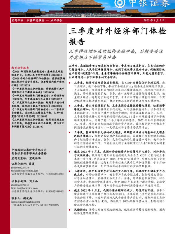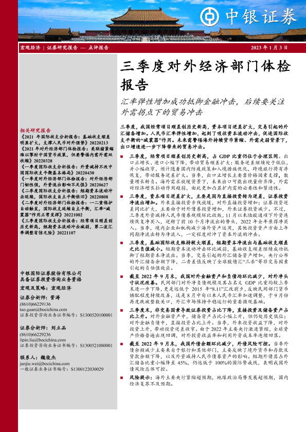 【中银证券】【20230103】三季度对外经济部门体检报告:汇率弹性增加成功抵御金融冲击,后续要关注外需拐点下的贸易冲击-17页
