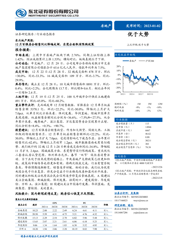 【东北证券】【20230102】东北地产周报:12月百强房企销售同比降幅走阔,东莞全面取消限购政策-22页