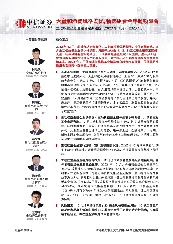 【中信证券】【20230106】主动权益型基金组合定期跟踪(2023年1月):大盘和消费风格占优,精选组合全年超额显著-16页