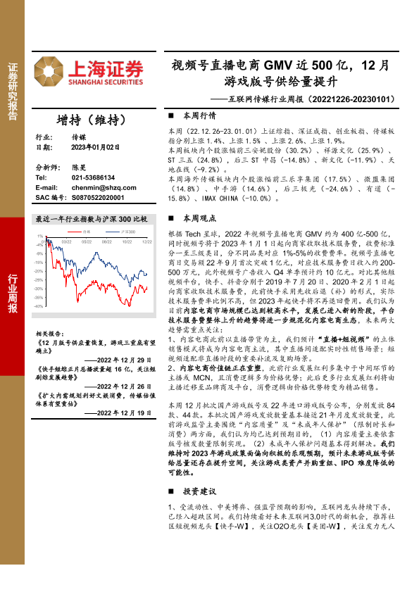 【上海证券】【20230102】互联网传媒行业周报:视频号直播电商GMV近500亿,12月游戏版号供给量提升-22页