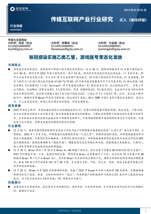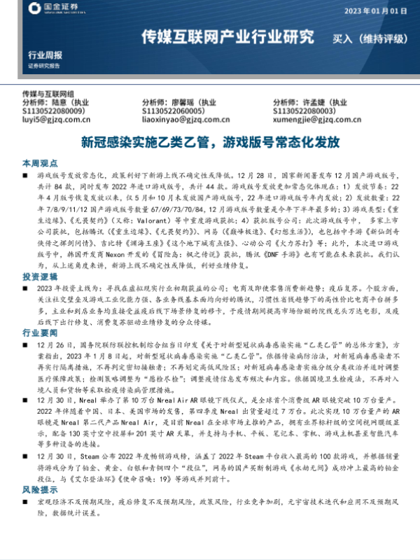 【国金证券】【20230101】传媒互联网产业行业研究:新冠感染实施乙类乙管,游戏版号常态化发放-18页