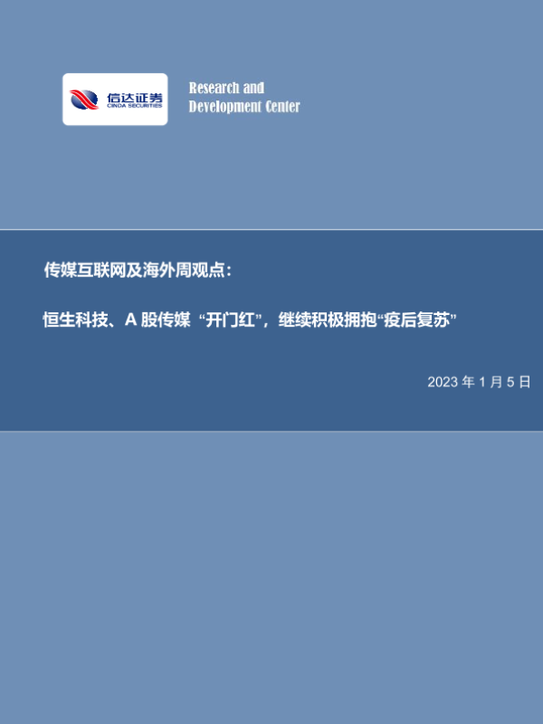 【信达证券】【20230105】传媒互联网及海外周观点:恒生科技、A股传媒“开门红”,继续积极拥抱“疫后复苏”-21页