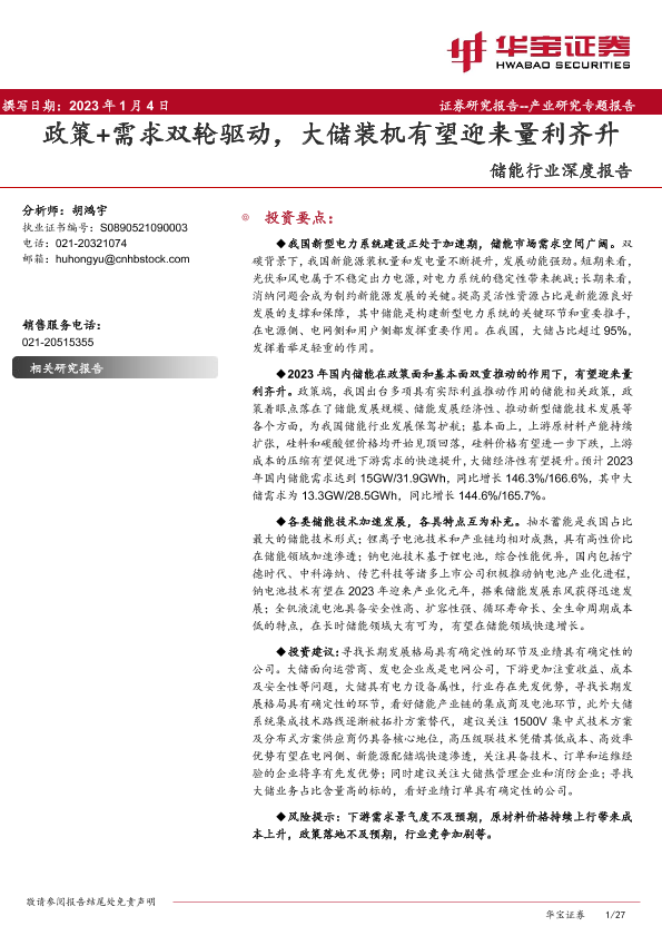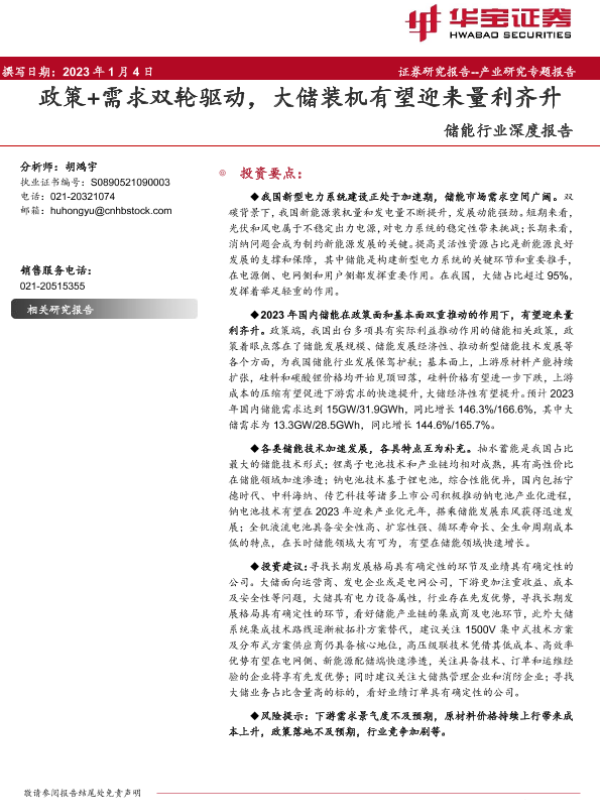 【华宝证券】【20230104】储能行业深度报告:政策+需求双轮驱动,大储装机有望迎来量利齐升-27页