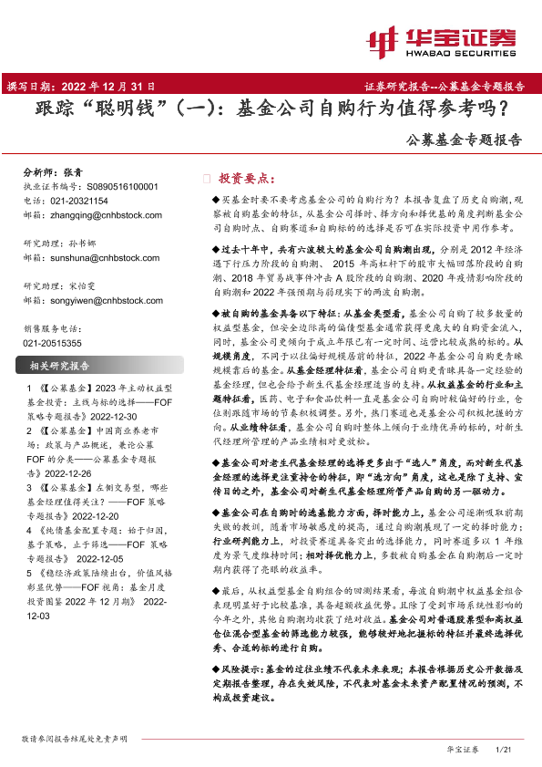 【华宝证券】【20221231】公募基金专题报告:跟踪“聪明钱”(一),基金公司自购行为值得参考吗?-21页