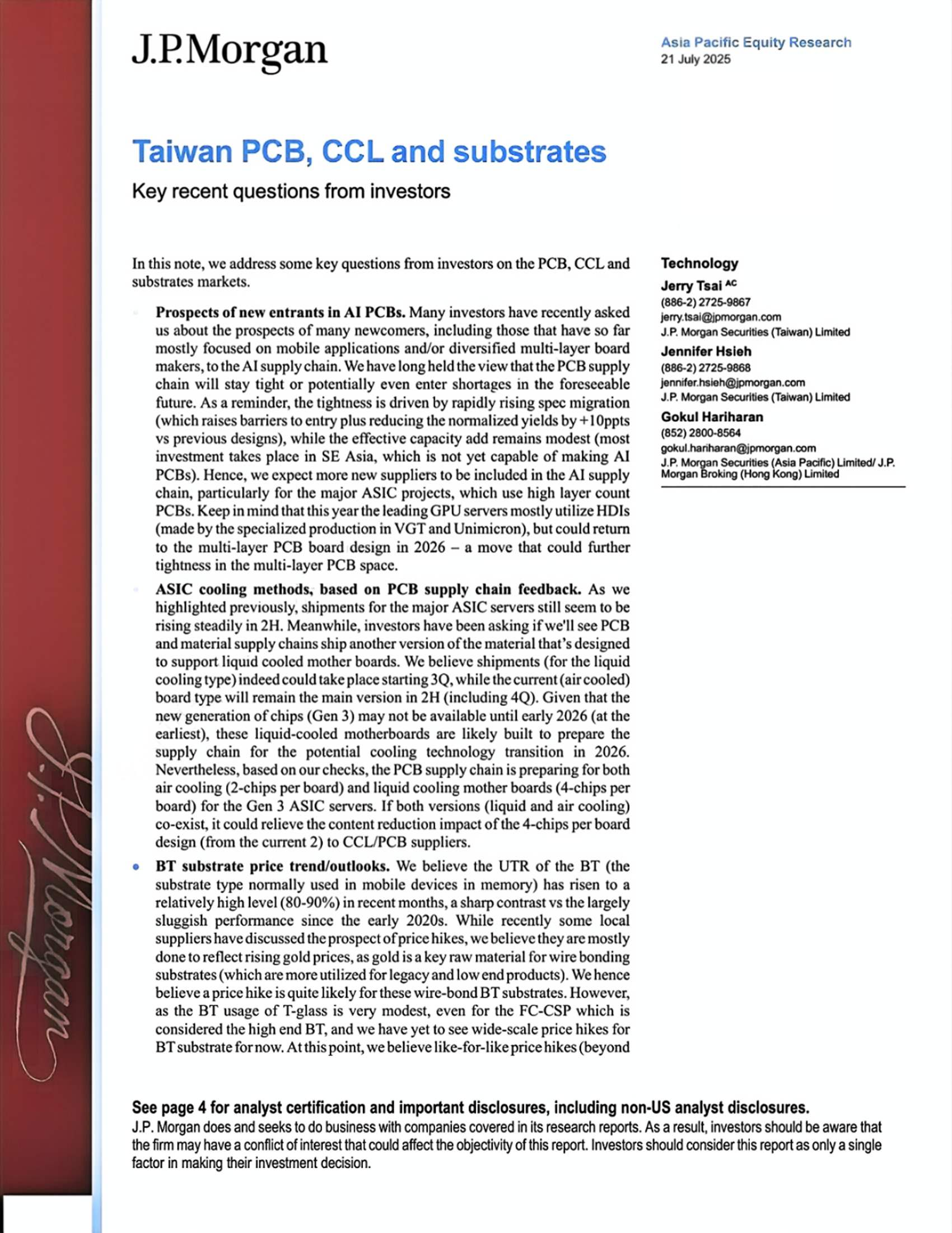 【J.P. Morgan】【202507】摩根大通-台湾PCB、CCL和基板投资者近期关注的主要问题-9页