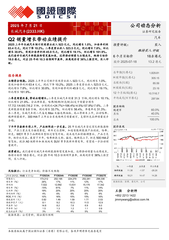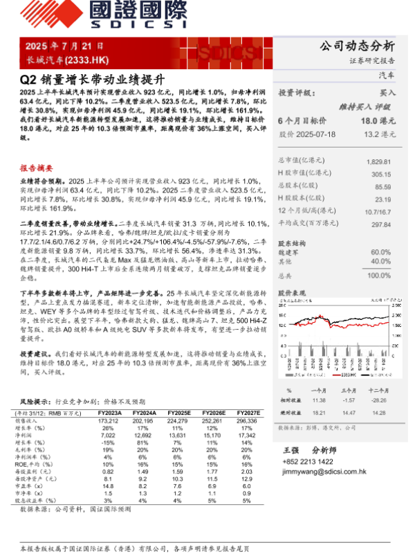 长城汽车 Q2销量 新能源转型 投资建议 业绩提升