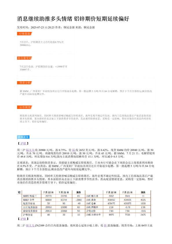【铜冠金源期货】【20250723】消息继续助推多头情绪 铝锌期价短期延续偏好-2页