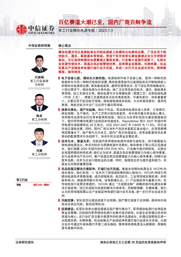 【中信证券】【20230103】军工行业模块电源专题:百亿赛道大潮已至,国内厂商百舸争流-29页