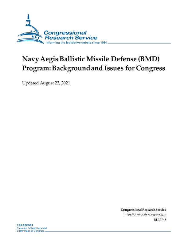 【Congressional Research Service】【20210823】国会研究服务部-美国海军宙斯盾弹道导弹防御(BMD)计划:背景和国会议题-37页
