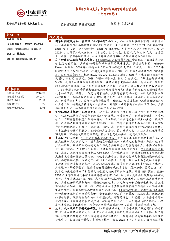 【中泰证券】【20221229】北交所新股简报:铜萃取剂领域龙头,新能源领域提前布局有望领跑-22页