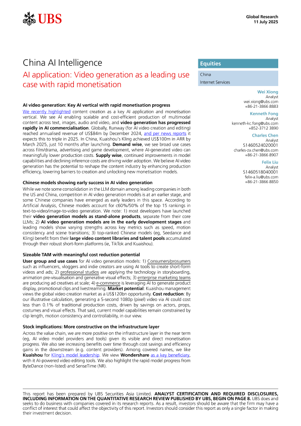 【UBS Securities Asia Limited】【20250711】AI application Video generation as a leading use case with rapid monetisation-17页