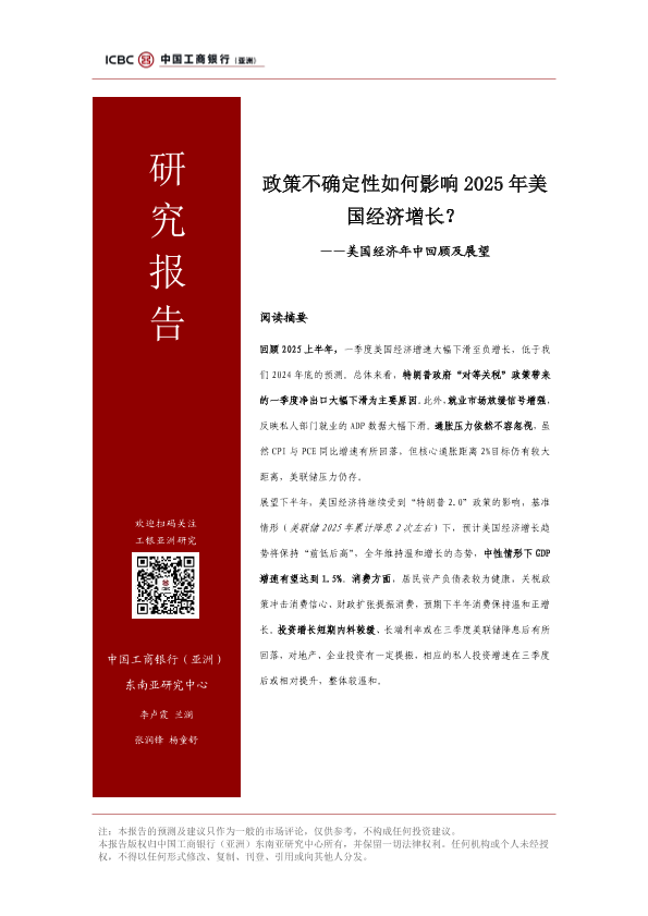 【中国工商银行(亚洲)东南亚研究中心】【20250724】政策不确定性如何影响2025年美国经济增长?——美国经济年中回顾及展望-14页