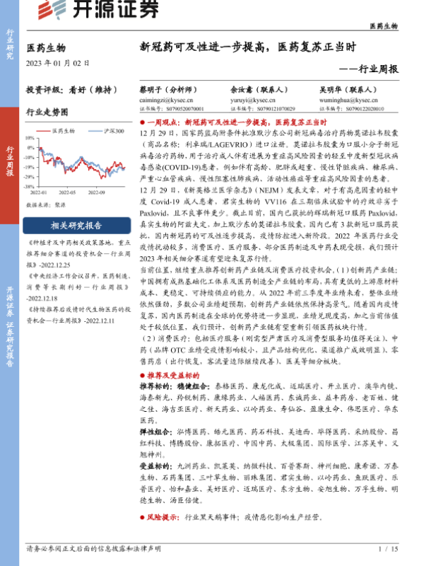 【开源证券】【20230102】医药生物行业周报:新冠药可及性进一步提高,医药复苏正当时-15页