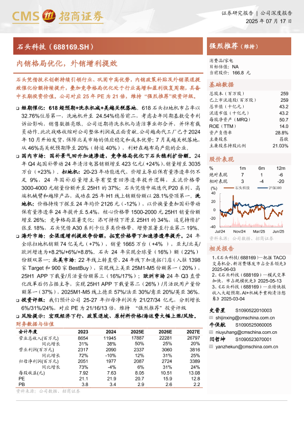 清洁电器 内销优化 石头科技 投资评级 外销增利