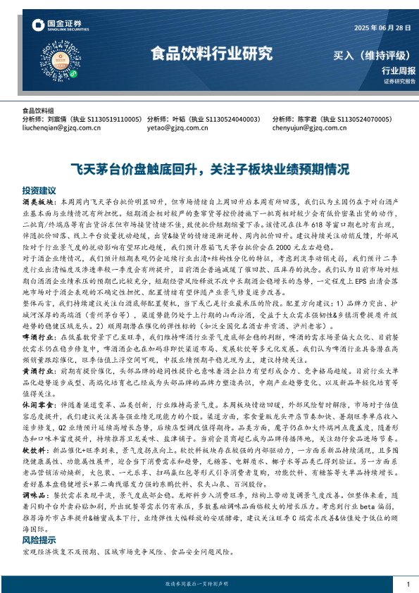 【国金证券】【20250628】食品饮料行业研究:飞天茅台价盘触底回升,关注子板块业绩预期情况-10页