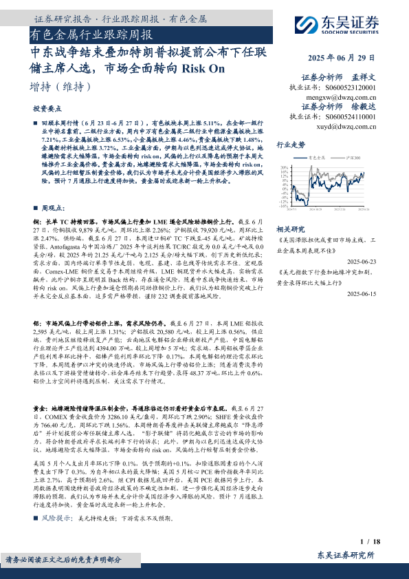 【东吴证券】【20250629】有色金属行业跟踪周报:中东战争结束叠加特朗普拟提前公布下任联储主席人选,市场全面转向Risk On-18页